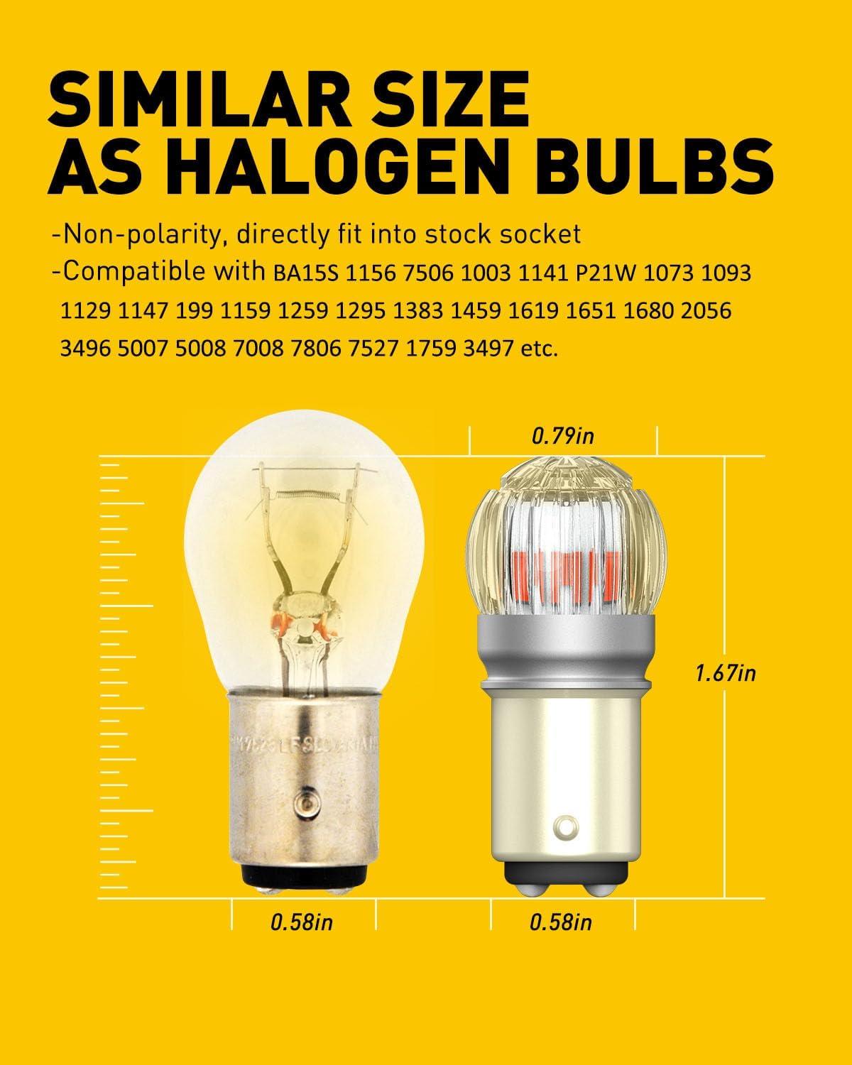 【Directly Fit & Multi Application】 Non-polarity, can be used for brake lights, tail lights, stop lights, etc. Compatible with socket BA15S 1156 7506 1003 1141 P21W 1073 1093 1129 1147 199 1159 1259 1295 1383 1459 1619 1651 1680 2056 3496 5007 5008 7008 7806 7527 1759 3497, etc.