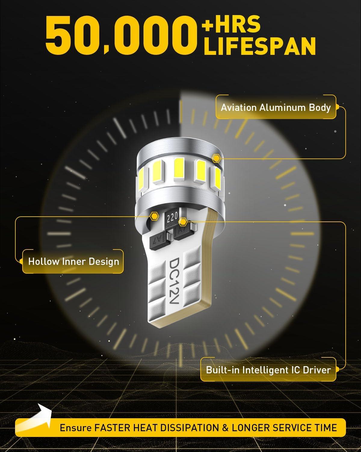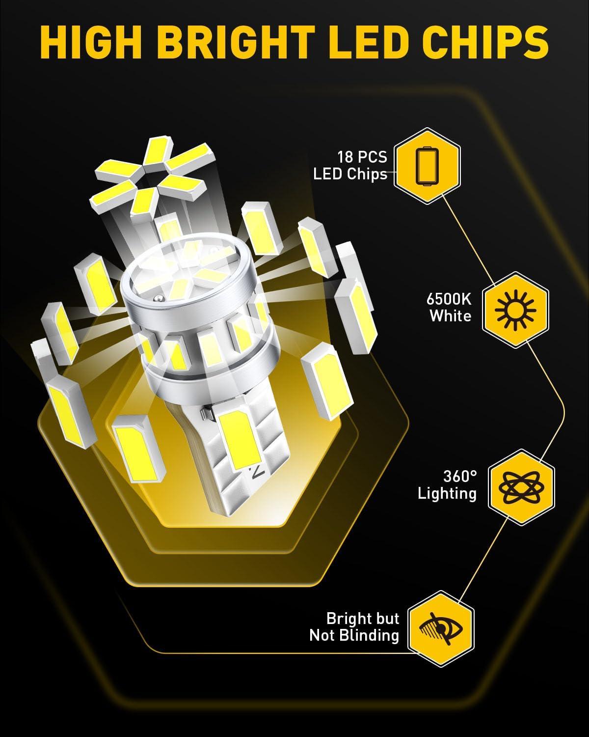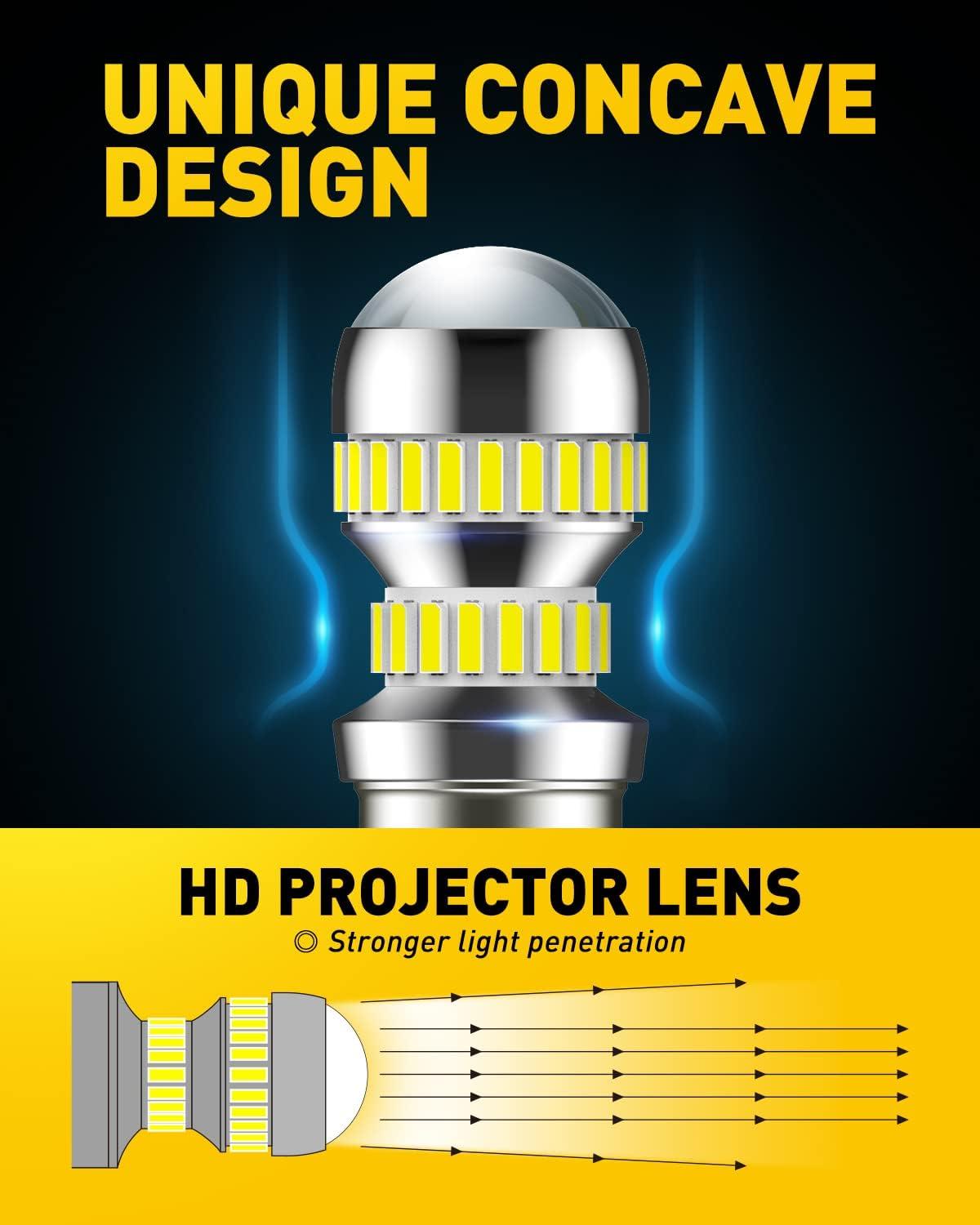 Resembling halogen bulb shape design and sequencing 54 4014-SMD LED chips precisely around the bulb. Delivering 360° high luminous efficiency with full 6000K white light, see more clearly and safely when reversing