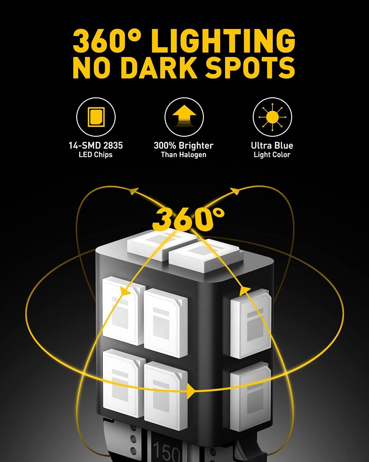300% BRIGHTER: AUXITO 194 LED bulbs equipped with 14 pieces high illumination 2835 SMD LED. 360° lighting angle, no dark spots, huge brightness. Bring your car a super bright blue light output
