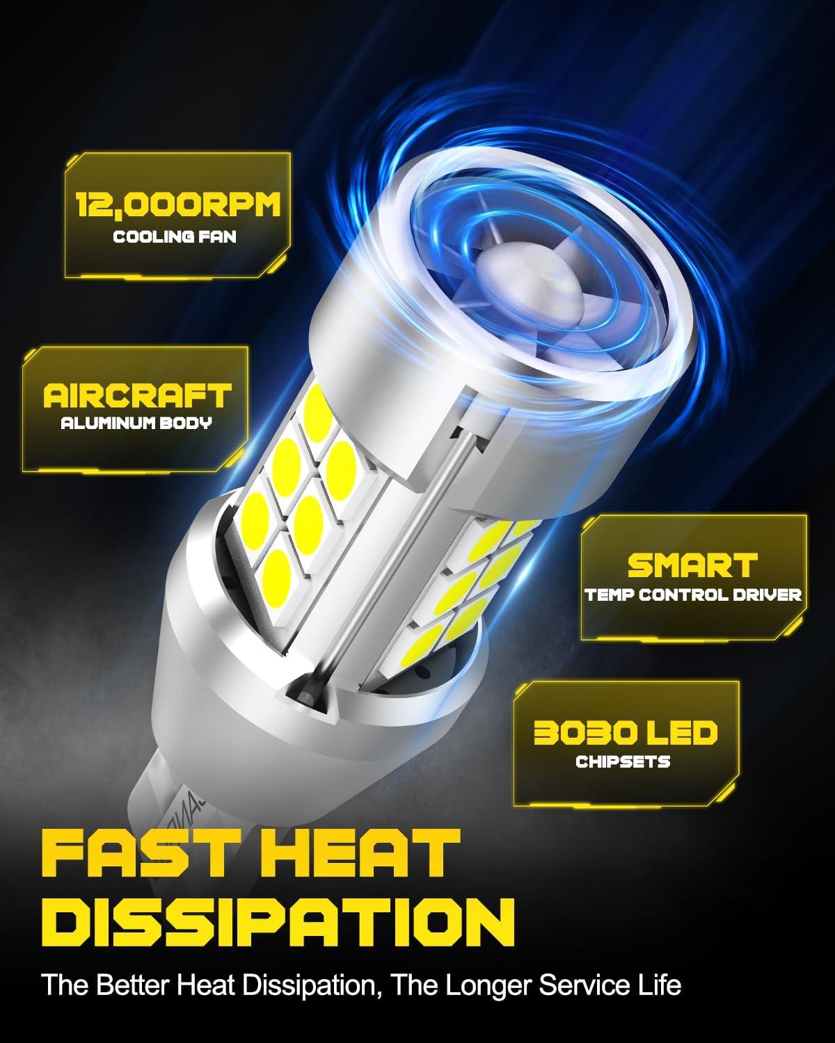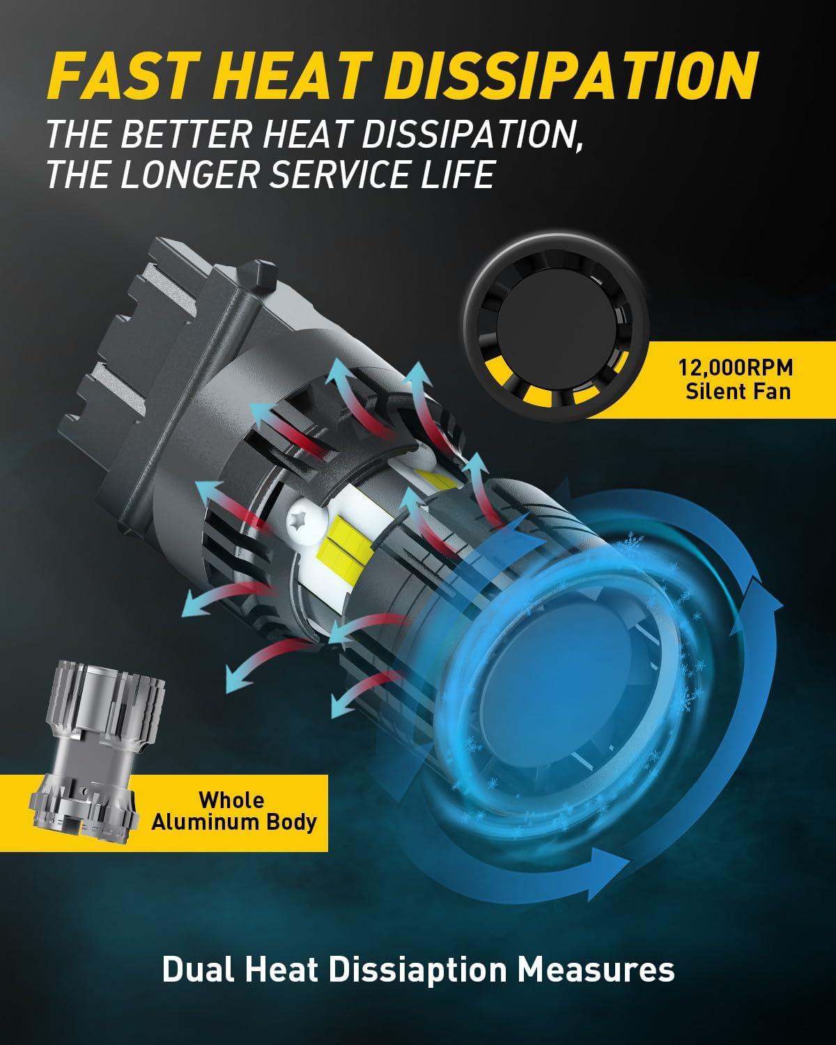50,000 Hours Lifespan: Whole aviation aluminum body and 12,000RPM turbo cool fan that diverts heat away from the light's critical components, our 7443 amber led bulbs offer 50000hr lifetime, reducing the need for frequent replacements.