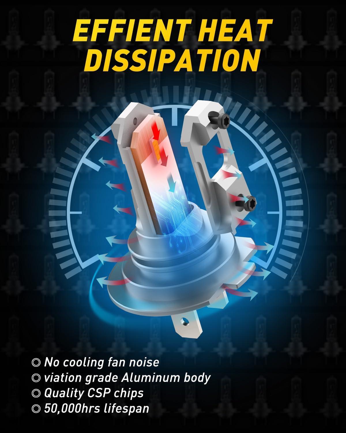 【Over 60,000 Hours Lifespan】AUXITO H7 bulb has a full aluminum body and a copper base board to prevent overheating. The design prolongs the lifespan of the bulbs to 60,000 hours, ensuring consistent brightness without burnout