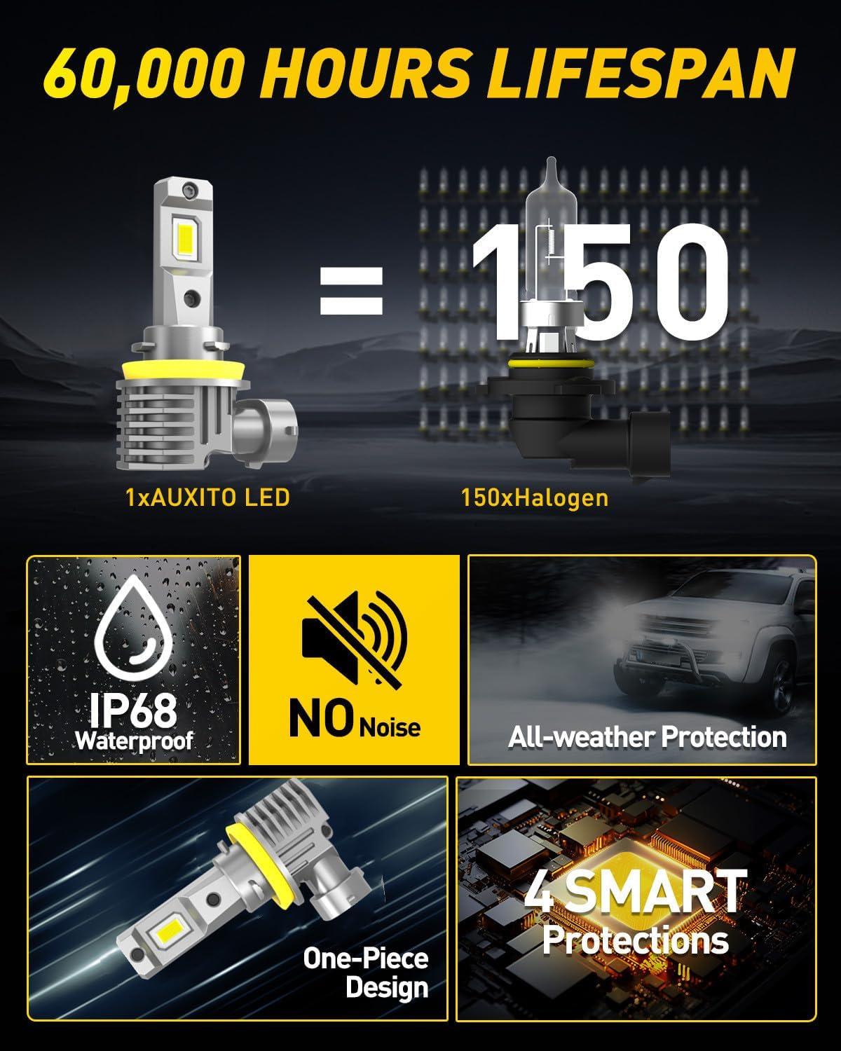 【Triple Cooling Design】Overheating of the bulb is the primary cause of the short lifespan. AUXITO HB2 led lights are designed with full body aluminum, high-speed cooling fan and copper base board, which can effectively prevent overheating and extend the life of the led bulb to 60,000 hours, will not diminish brightness and burn out over time