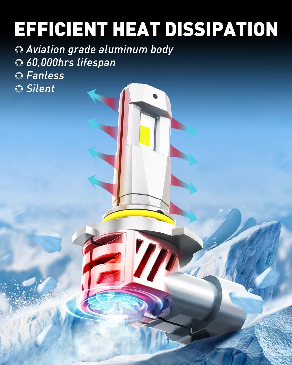 [60000 HRS+ Lasting Lifespan]: AUXITO hb3 hb4 bulbs feature a solid aviation aluminum body and a high-efficiency copper cooling base, heat dissipates rapidly from the LED chips. This innovative passive cooling system ensures stable performance and extends the lifespan to over 60,000 hours of reliable use.