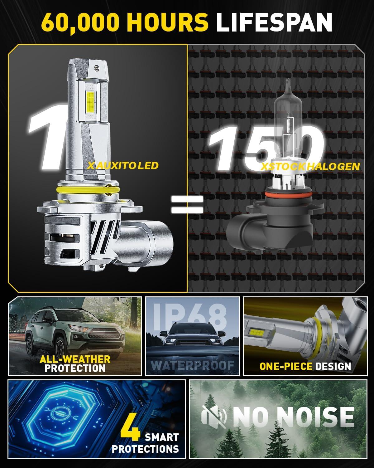 [All-Weather Reliability & Perfect Fit]: AUXITO 9005 bulbs and 9006 bulbs combo is equipped with an intelligent CANbus decoder for 99% vehicle compatibility—no error messages or flickering. The IP68 waterproof and dustproof rating guarantees flawless performance in heavy rain, snow, and extreme temperatures year-round.