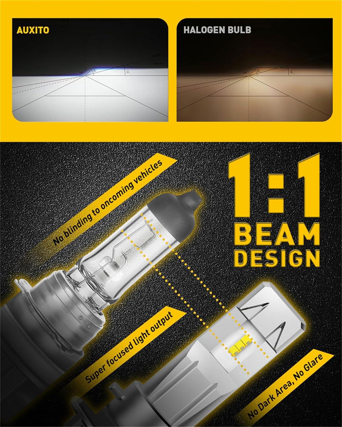 Optimal Beam Pattern: These bulbs deliver a precise and well-focused beam with no dark spots, ensuring a wide and even light distribution, reducing glare for oncoming drivers and offering better road coverage