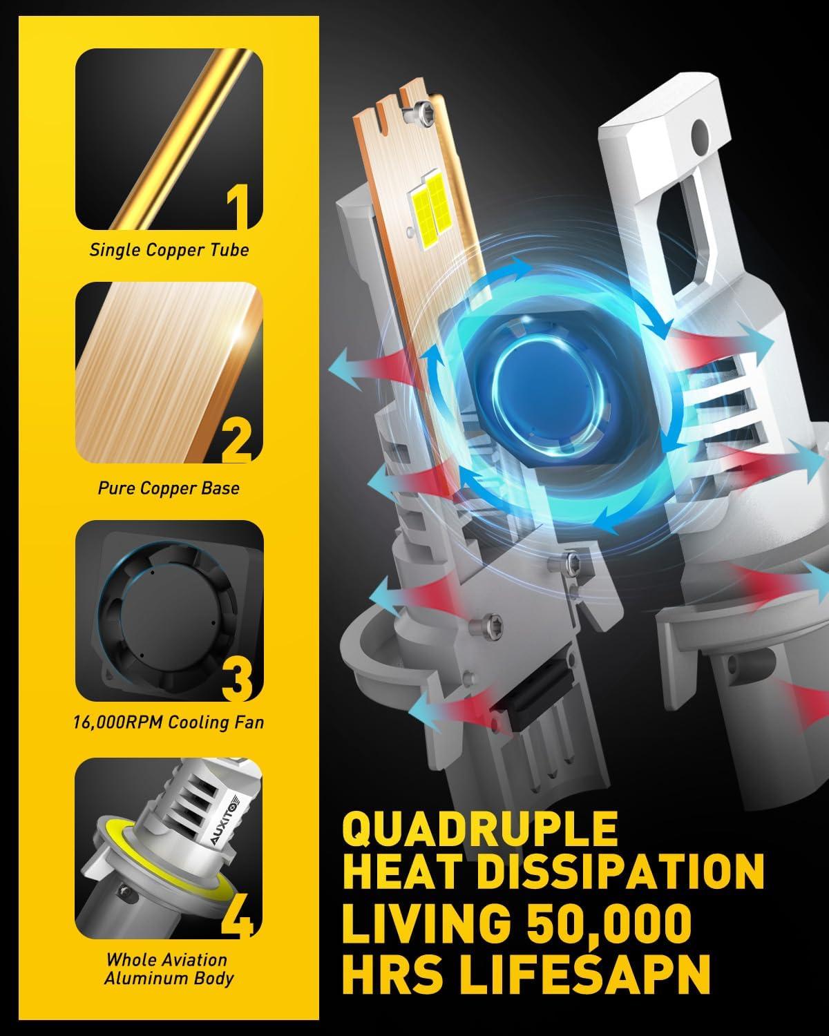 **60,000 hrs Lifespan**: Designed for durability, hb3 hb4 driving bulbs for high and low beams are equipped with an efficient cooling system, including a copper base plate, vacuum heat dissipation tube, and aluminum housing, along with a 12,000RPM turbo fan for optimal performance.