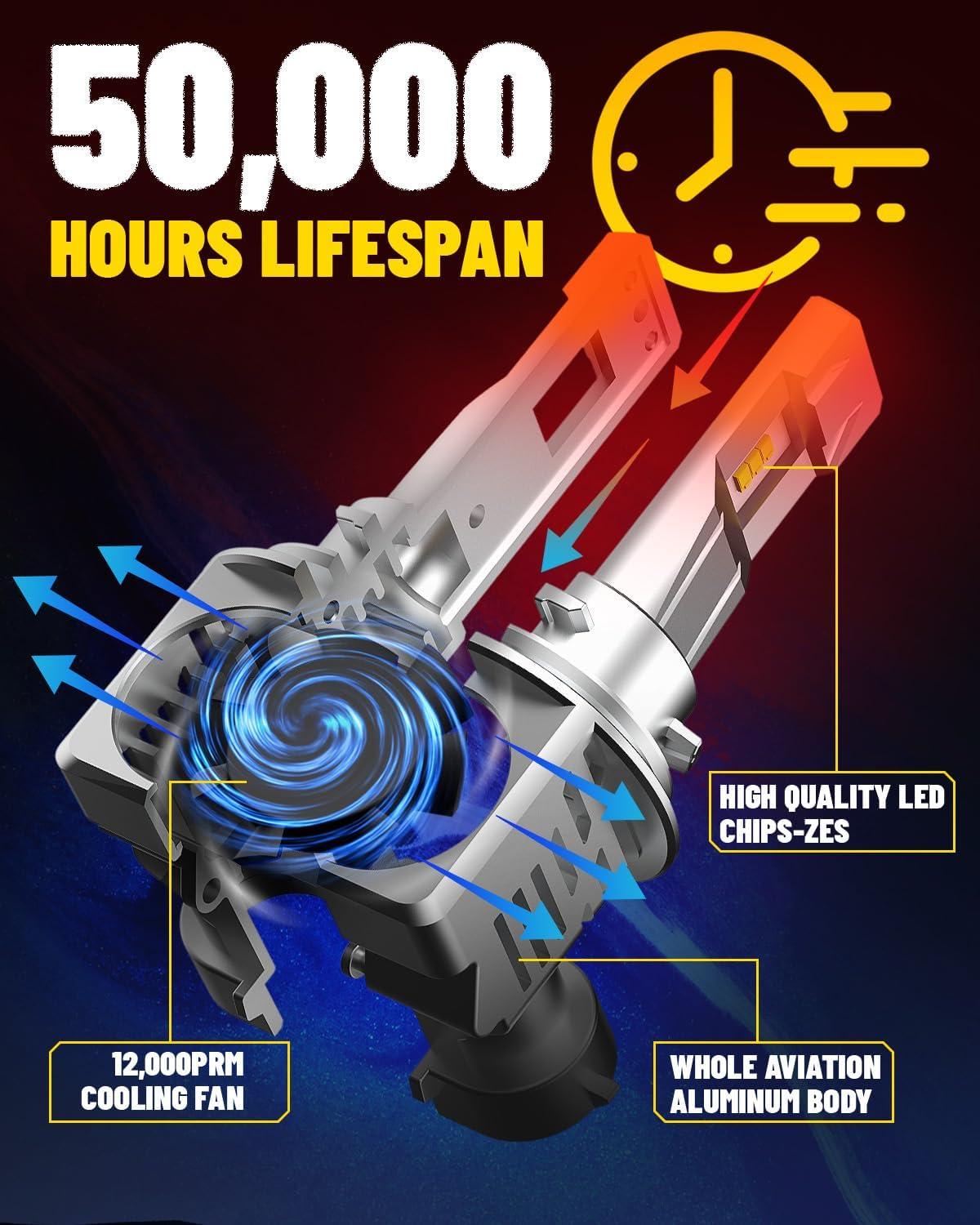 Crafted with a full aviation aluminum body, 15,000RPM turbo cooling fan, and a unique hollow-carved heat sink. AUXITO 9006 hb4 led bulbs deliver superior heat dissipation. Skip frequent replacements