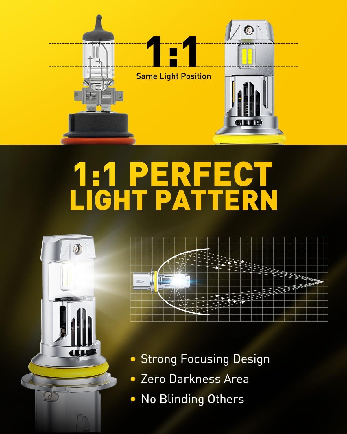 [1:1 Beam Pattern]: AUXITO hb5 9007 1:1 simulate the beam pattern of halogen bulbs, use ultra-thin 0.03in baseboard to ensure 360° lighting without black spots. And the emitted light beam is focused on the ground, will not cause glare to oncoming drivers