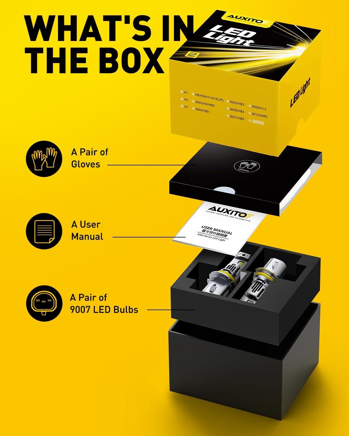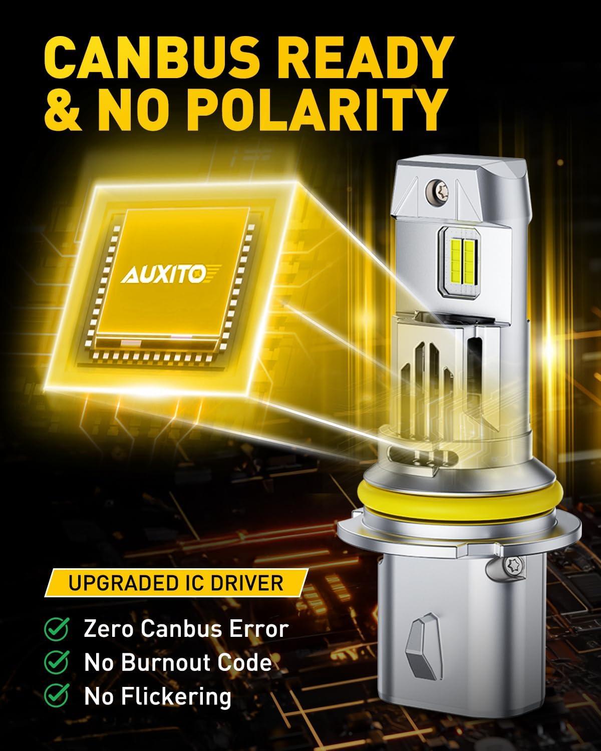 [900% Brighter]: AUXITO 9007 light bulbs are designed with 16PCS chips, 6500K cool white, 40000Lumen per set, 900% brighter than stock halogen bulbs, a perfect upgrade for halogen lights. Allows driver get a farther, brighter, and clearer vision when driving at night