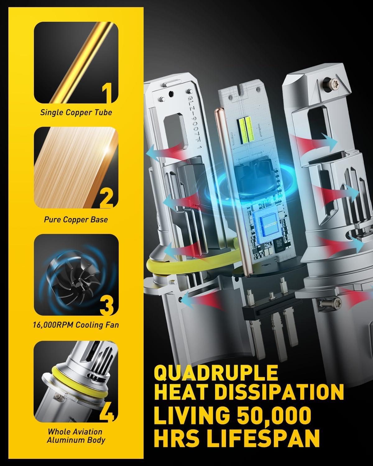 [50,000+hrs Lifespan]: The advanced chip technology effectively reduces the energy consumption of 9007 light during operation. Premium aviation aluminum and 16,000RPM high-speed silent cooling fan effectively pull the heat away from the chips, which ensures long service life of up to 50,000 hours
