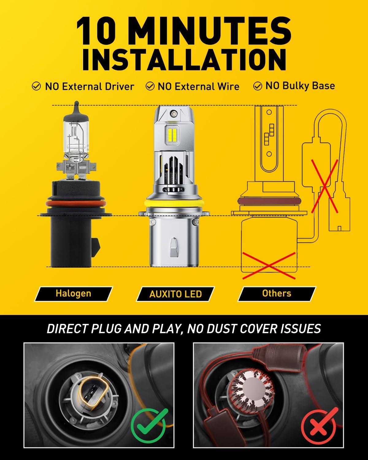 [5min Installation]: Unlike other lights, AUXITO 9007 bulbs have no external driver and connector, fully all in one. That makes the bulbs almost the same size as the halogen bulb. Due to the wireless design, installation is a breeze, just plug and play