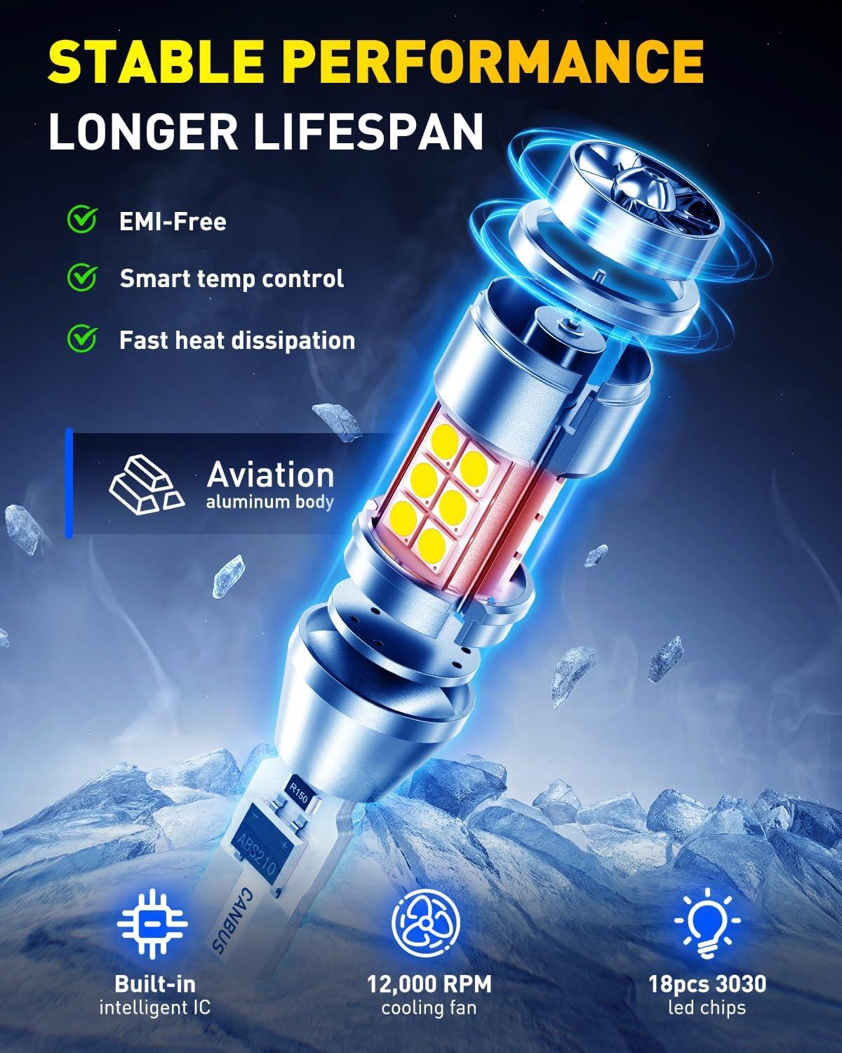 【Built-in High-Speed Cooling Fan for 500% Faster Heat Dissipation】Equipped with a built-in silent cooling fan, combined with aviation-grade aluminum alloy housing and immersion gold process plugs, achieving 500% faster heat dissipation than standard bulbs. Effectively reduces operating temperature and prevents light decay, ensuring stable performance.