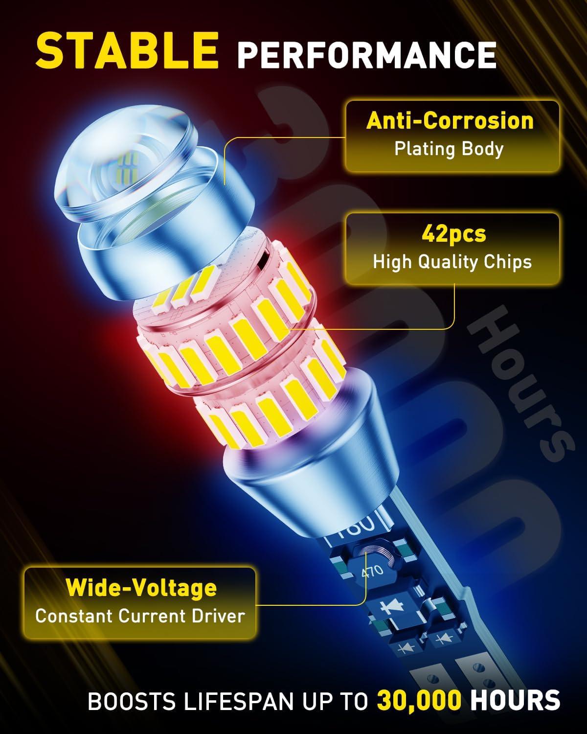 Consumes only 25% of the power of halogen 921 bulbs, reducing the load on your vehicle's battery. With a super-long lifespan of up to 30,000 hours (10x longer than halogen), eliminating frequent disassembly and replacement, saving you cost and hassle in the long run.