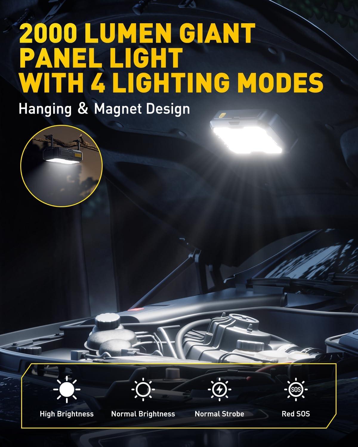 SUPER BRIGHT PANEL LIGHT: Equipped with a super bright LED panel light offering 2000 lumens, AUXITO car starter jump box includes four lighting modes (Lighting, Strobe, and SOS) for maximum visibility in emergencies or while camping at night. With a built-in hook and a strong magnet, this portable car battery jump starter allows for hands-free operation