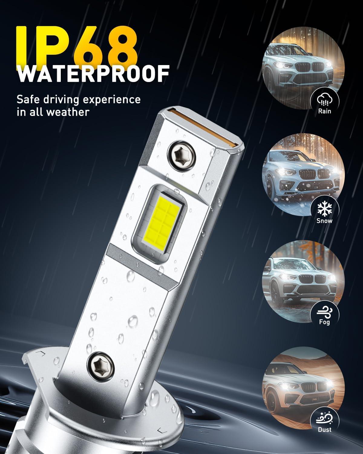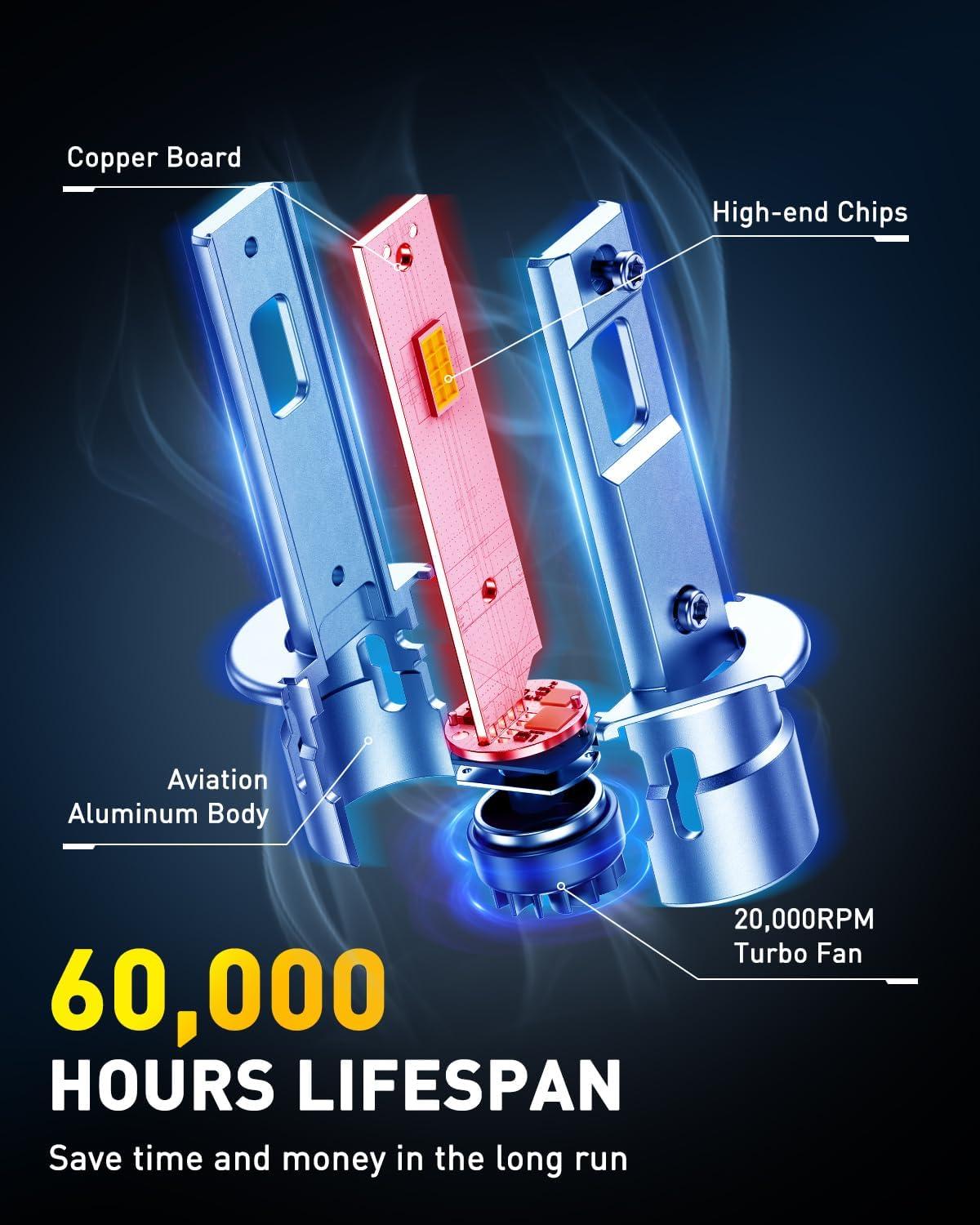 【Built to Last 60,000+ Hours】AUXITO H1 bulbs feature an aviation-grade aluminum housing, copper cooling plates, and a 20,000 RPM silent turbo fan. Together, they actively manage heat to ensure extreme durability and unwavering performance