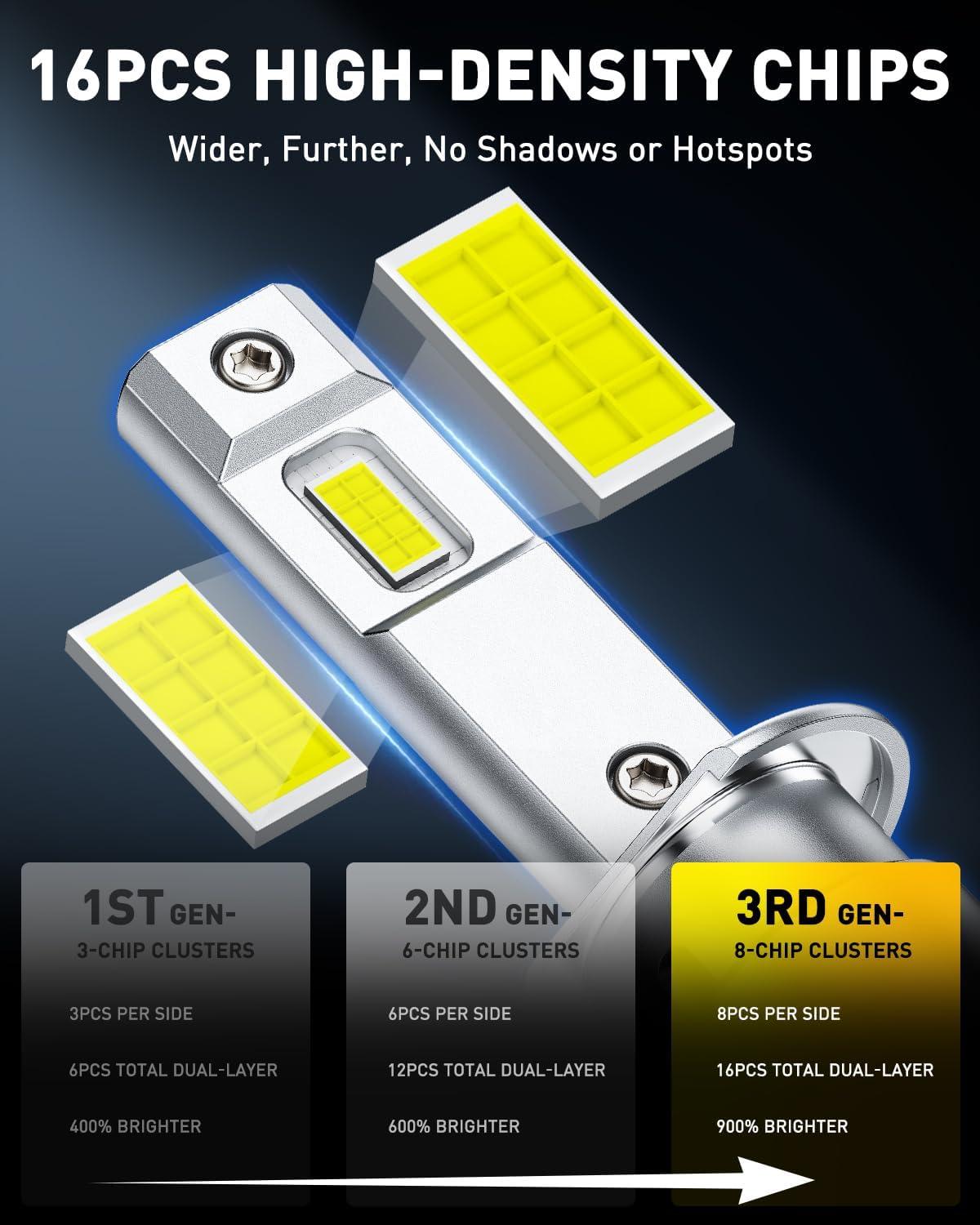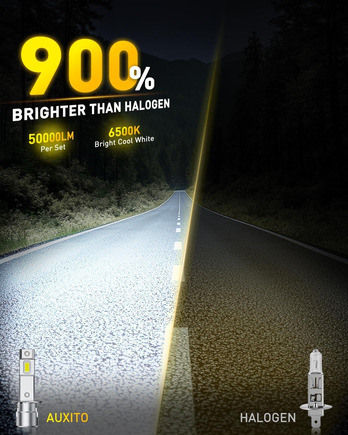 【900% Brighter Than Halogen】Upgrade to AUXITO H1 bulbs with 16 high-intensity LED chips and 50,000 lumens, they deliver a dramatic 900% boost over halogens, turning total darkness into daylight-like clarity