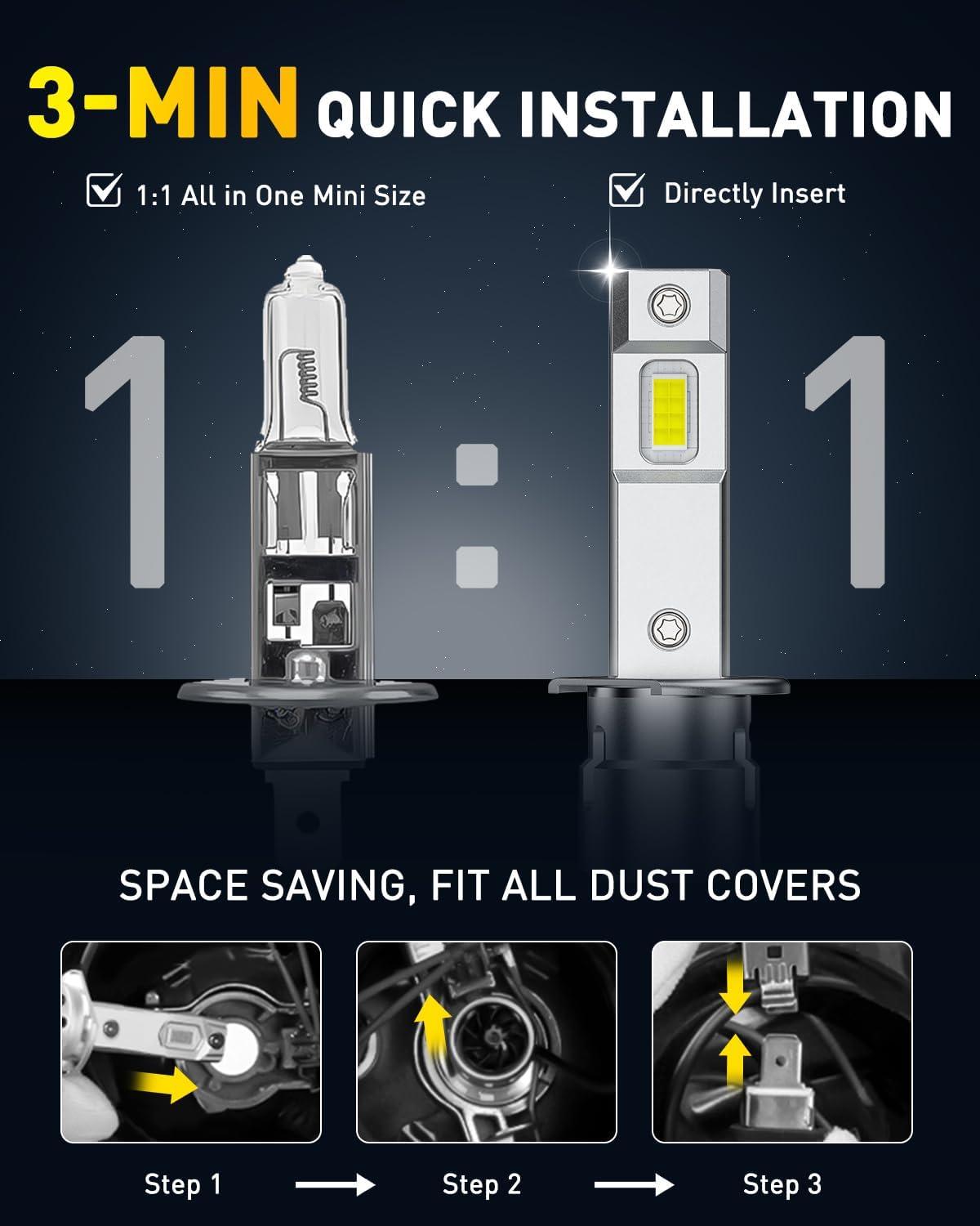 【True Plug&Play Installation】Designed with a 1:1 size and no bulky external drivers, AUXITO H1 bulbs fit directly into factory housings. Their compact form even works behind tight dust covers, for a complete install in under 3 minutes