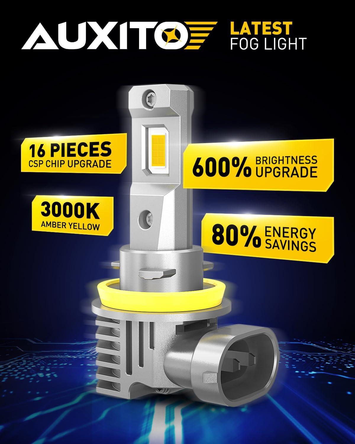 ENHANCED VISIBILITY: AUXITO H11 yellow LED fog light bulbs are made of advanced LED chips, 600% brighter than halogen lights. 3000K amber yellow light can effectively penetrate rain/snow/fog, improve road visibility, escort your journey and drive safely