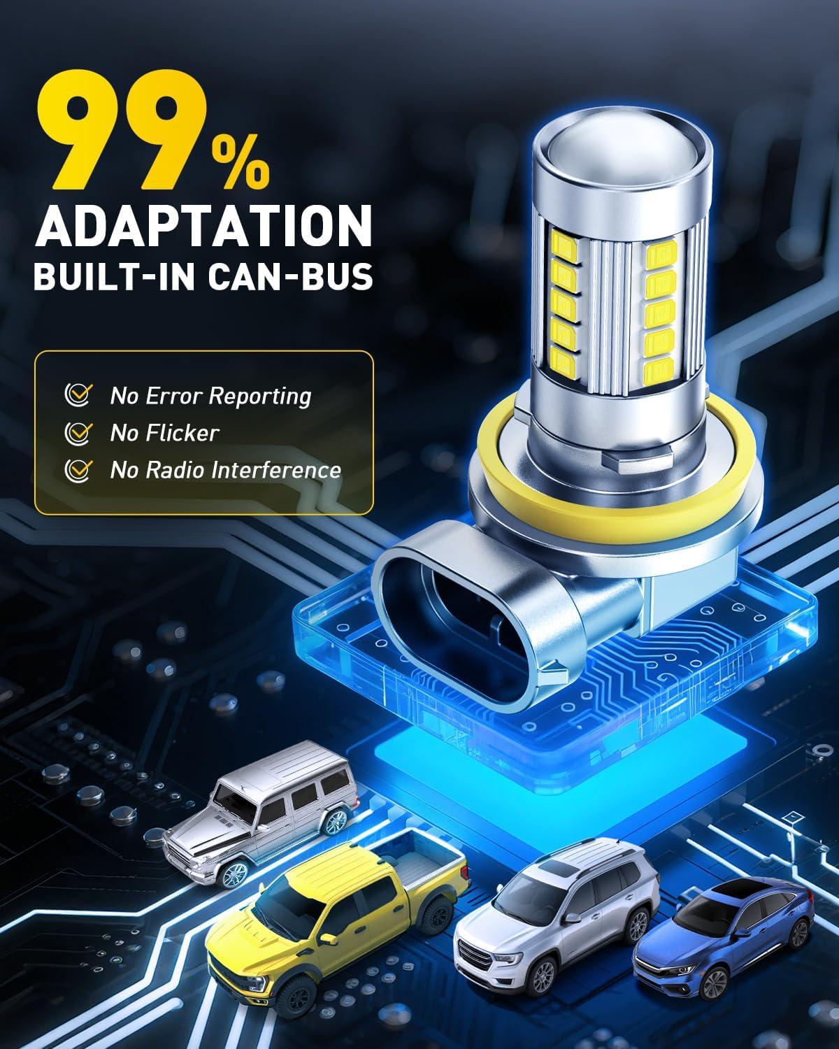 INTELLIGENT COMPATIBILITY SYSTEM:Thanks to the built-in intelligent IC system, AUXITO H16 yellow fog light bulbs are perfectly compatible with fog lights or daytime running lights, whether for cars, SUVs or trucks. No error, plug and play