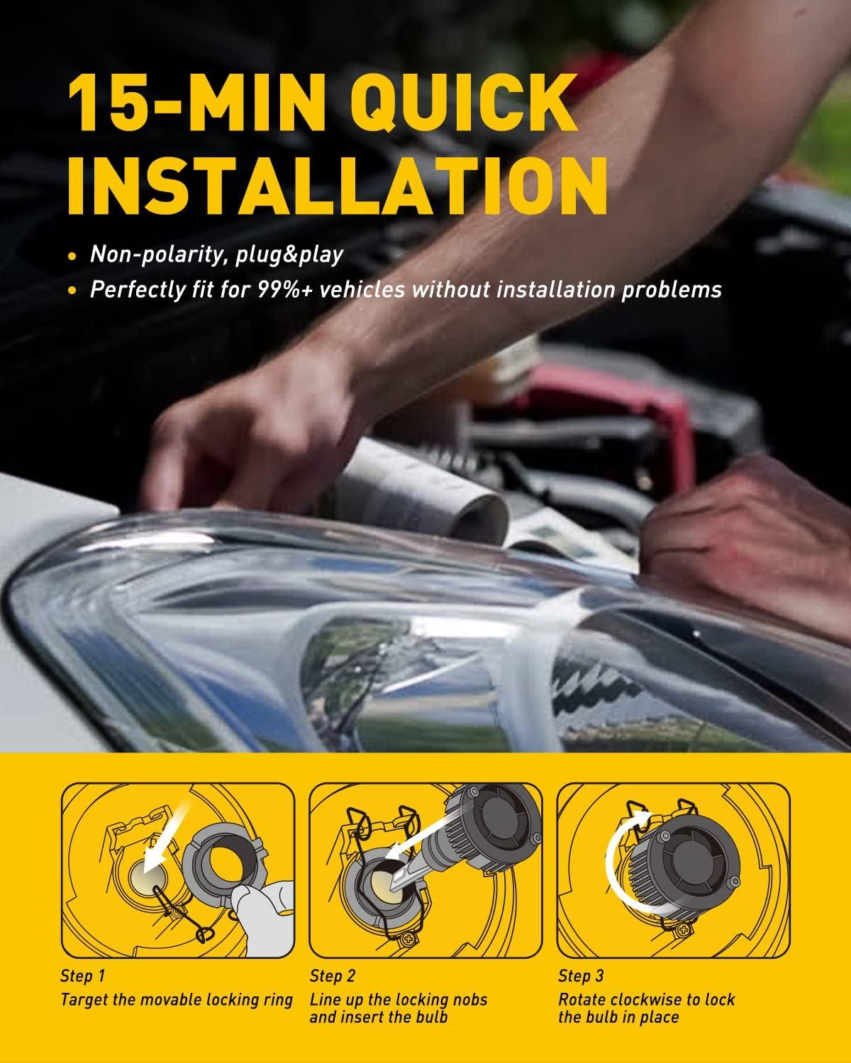 Quick & Easy Installation: The AUXITO H4 light bulbs are designed with a mini-size that closely mimics halogen bulbs for a perfect fit, eliminating the need for modifications. Featuring a non-polarity socket and free from radio interference, these bulbs are a breeze to install, thanks to their plug-and-play technology. Complete your hassle-free upgrade in under 10 minutes.