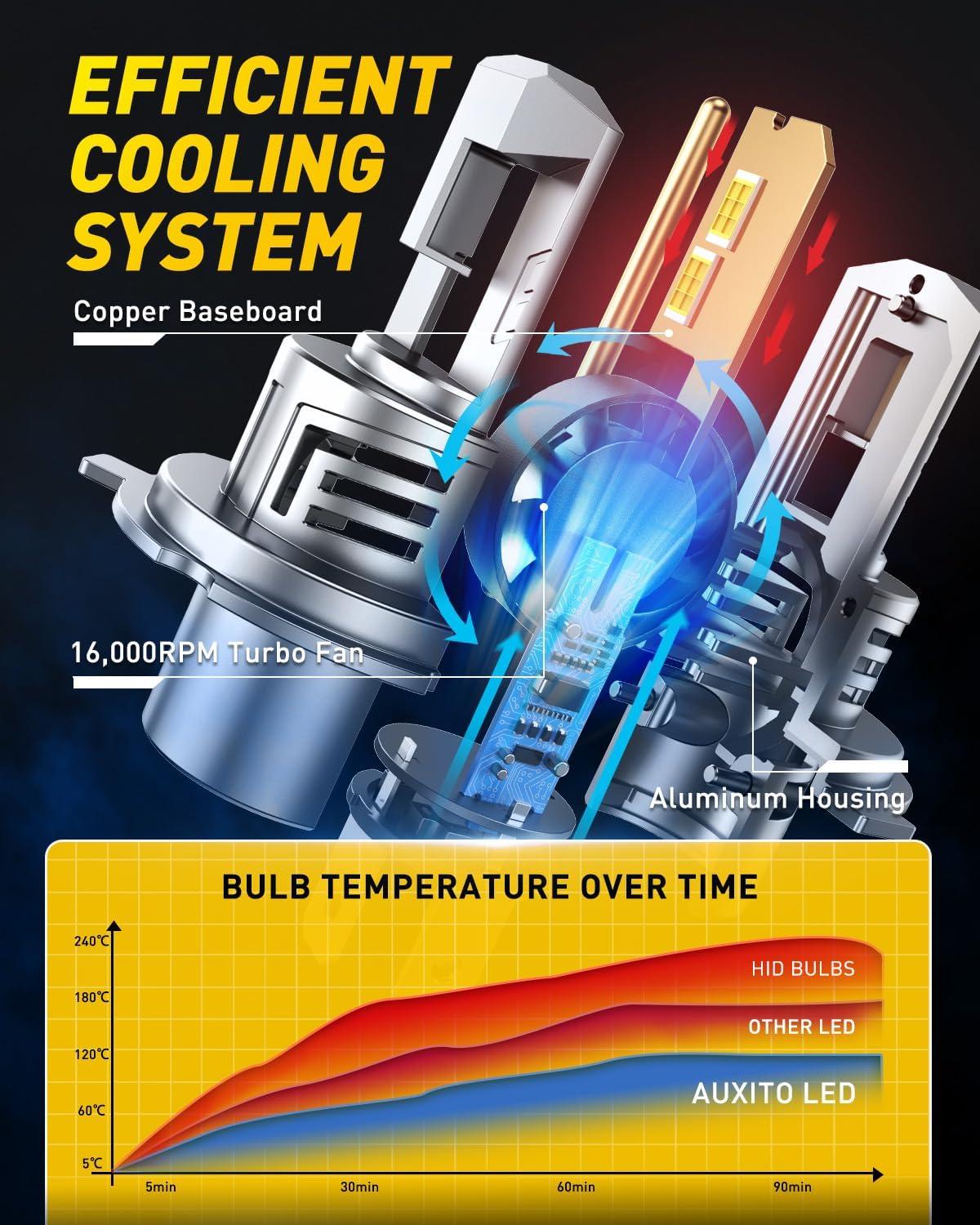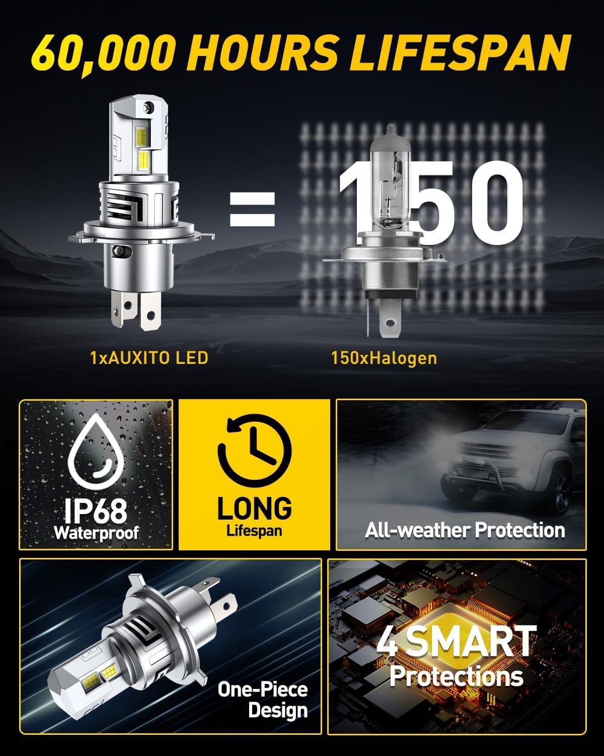 【Extended Service Life】 Through innovative thermal management and all-aluminum construction, AUXITO H4 bulb achieves remarkable 60,000-hour longevity – outlasting multiple vehicle ownership periods.