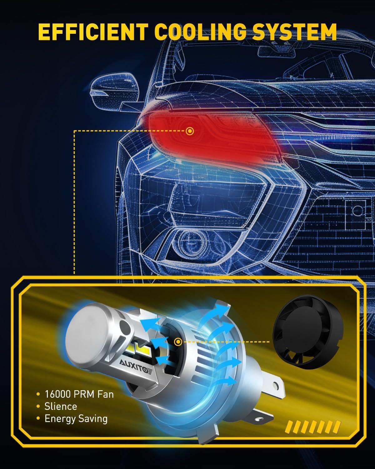 Long-lasting Durability: Constructed with a sturdy aluminum body, double copper tubes, and a copper baseboard, AUXITO 9003 H4 bulbs are built to last. Equipped with a 12,000RPM silent cooling fan, these bulbs efficiently dissipate heat, extending their lifespan to an outstanding 60,000 hours—equivalent to over 20 years of use. Enjoy the convenience of infrequent replacements and reliable, long-lasting illumination.