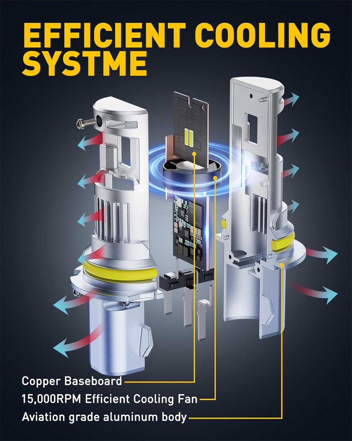 【Advanced Triple-Cooling Technology】Say goodbye to overheating issues with our integrated cooling system—featuring a full aluminum body, high-speed cooling fan, and copper base board. effectively dissipates heat, ensuring a prolonged lifespan of up to 60,000 hours without loss of brightness or premature failure