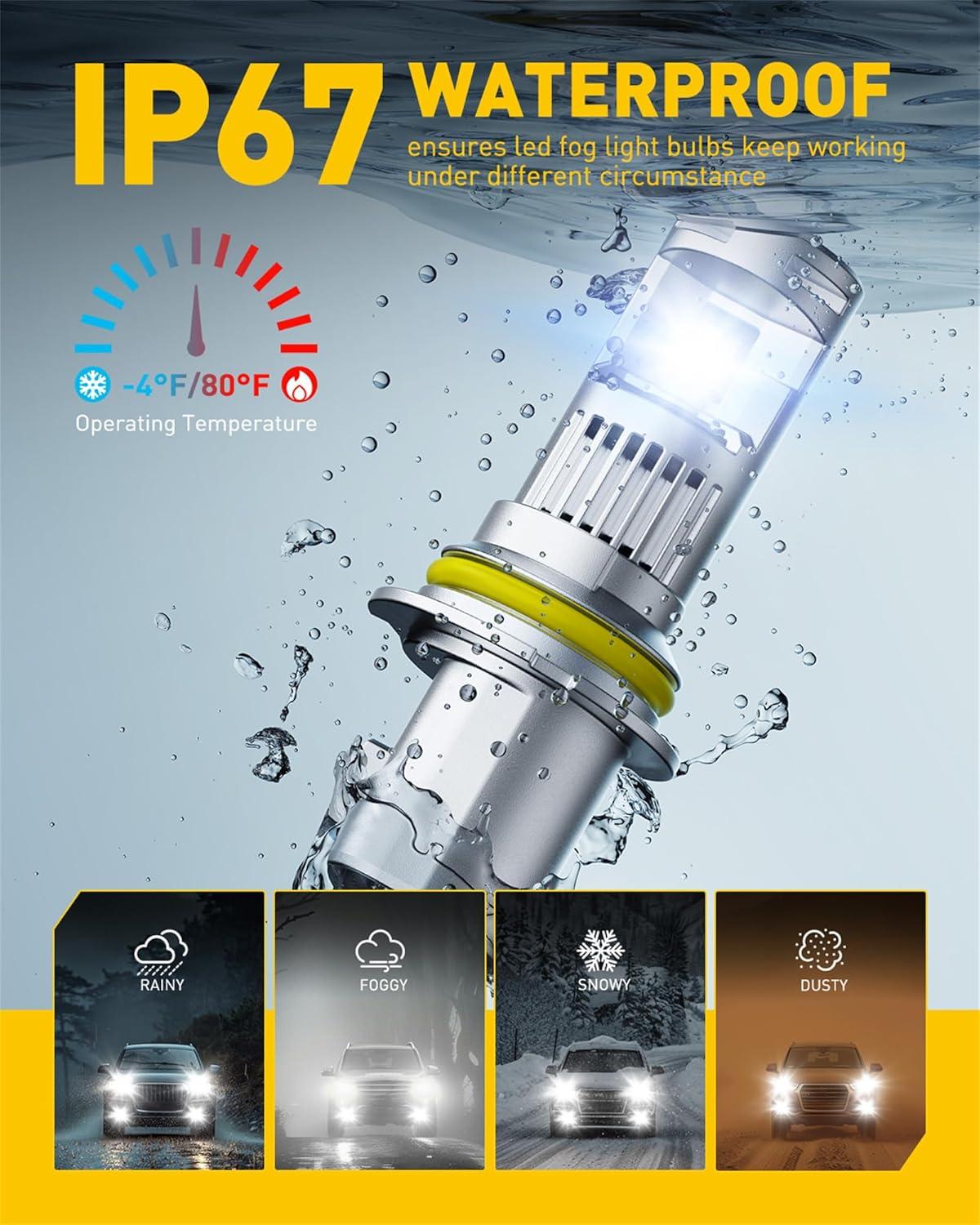 【Over 50,000 Hours Lifespan】AUXITO H7 led fog light bulbs are constructed with an all-aluminum body and a temperature control circuit system, offering excellent heat dissipation. This design effectively prevents LED chip overheating, greatly extending the bulb's lifespan to over 50,000 hours