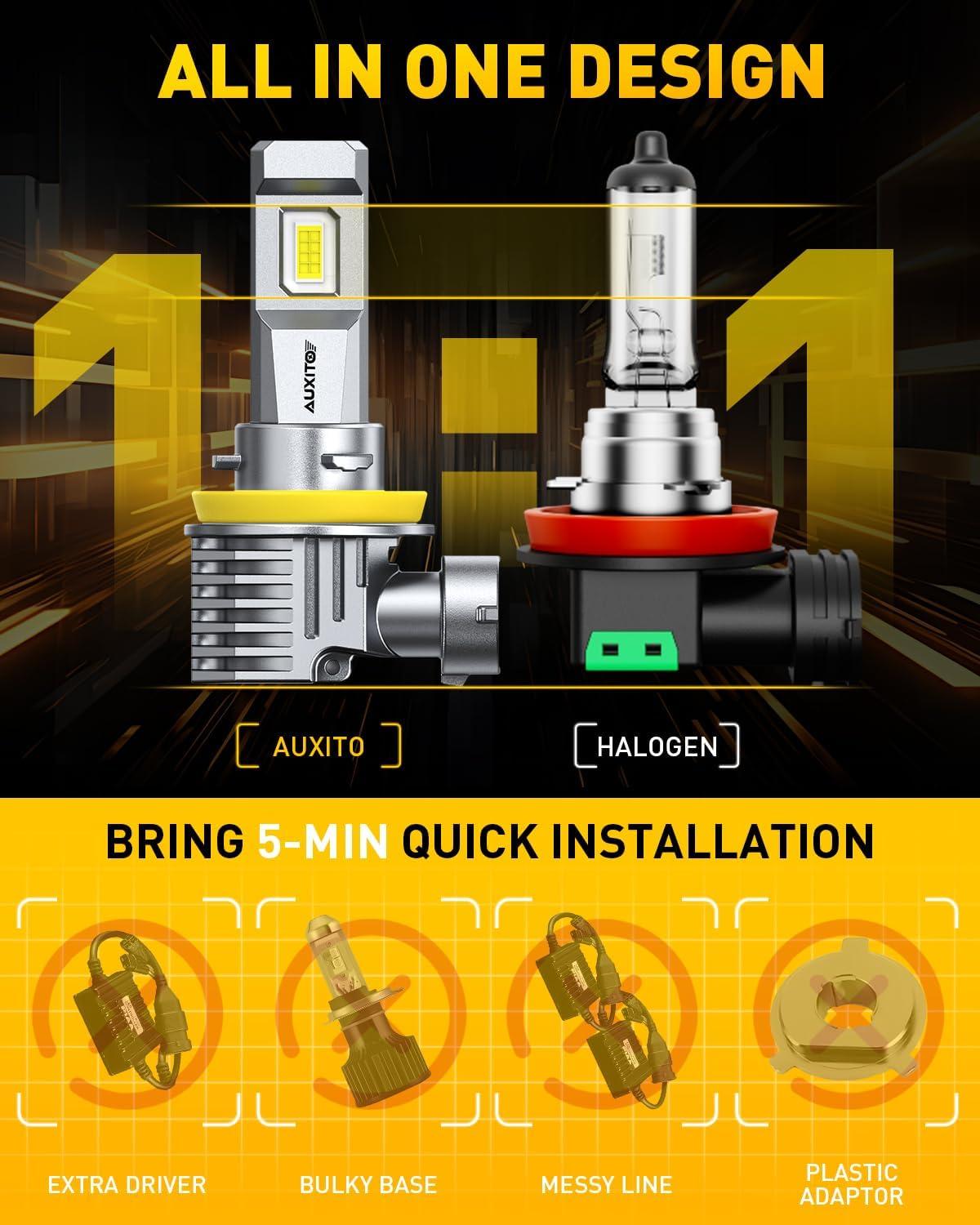 【1:1 Mini Size, Easy to Install】AUXITO H7 bulbs adopt the all-in-one 1:1 mini size and non-polarity design, no additional adapters needed, real plug and play. you can directly fit these bulbs into your car's housing, eliminating complex installation challenges