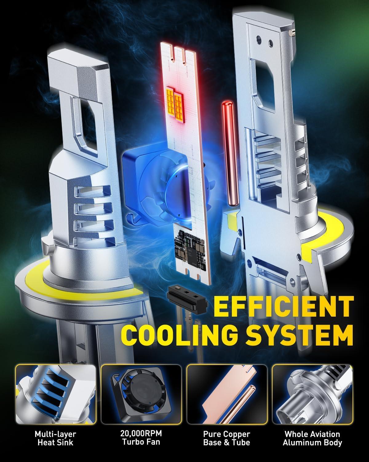 【Advanced Triple-Cooling Technology】Say goodbye to overheating issues with our integrated cooling system—featuring a full aluminum body, high-speed cooling fan, and copper base board. effectively dissipates heat, ensuring a prolonged lifespan of up to 60,000 hours without loss of brightness or premature failure