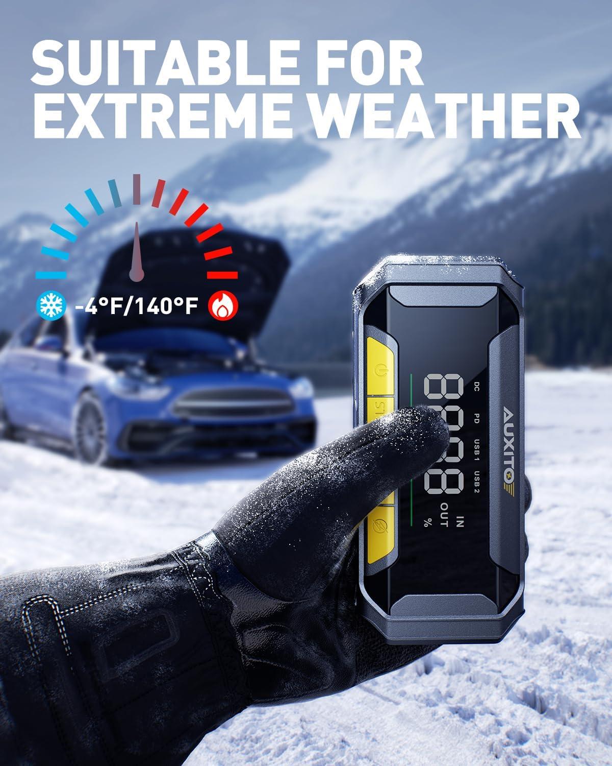 ➤【Powerful Jump Starter】AUXITO portable jump starter with up to 6000A peak current and the latest QDSP technology, instantly starts 12V vehicles (up to 10.5L gas/10L diesel) even in extreme weather from -4°F to 140°F. A single charge can start 50 times, suitable for cars, trucks, motorbikes, boats, RVs, or tractors