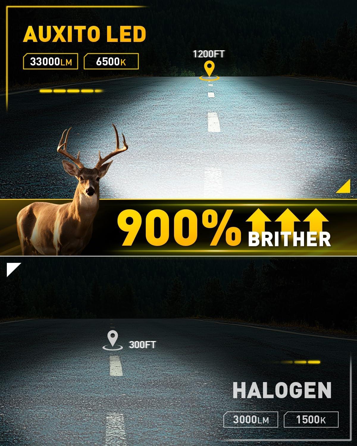 【1000% Brighter Than Halogen】Engineered with 32 high-power LED chips, the AUXITO H13 bulb delivers 50,000 lumens per set – 1000% brighter than stock halogens. Drive with daytime clarity, even in total darkness