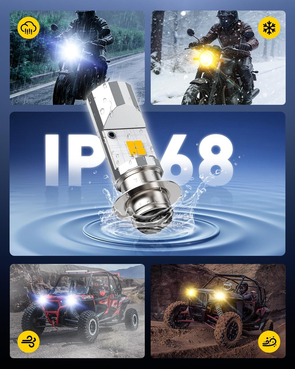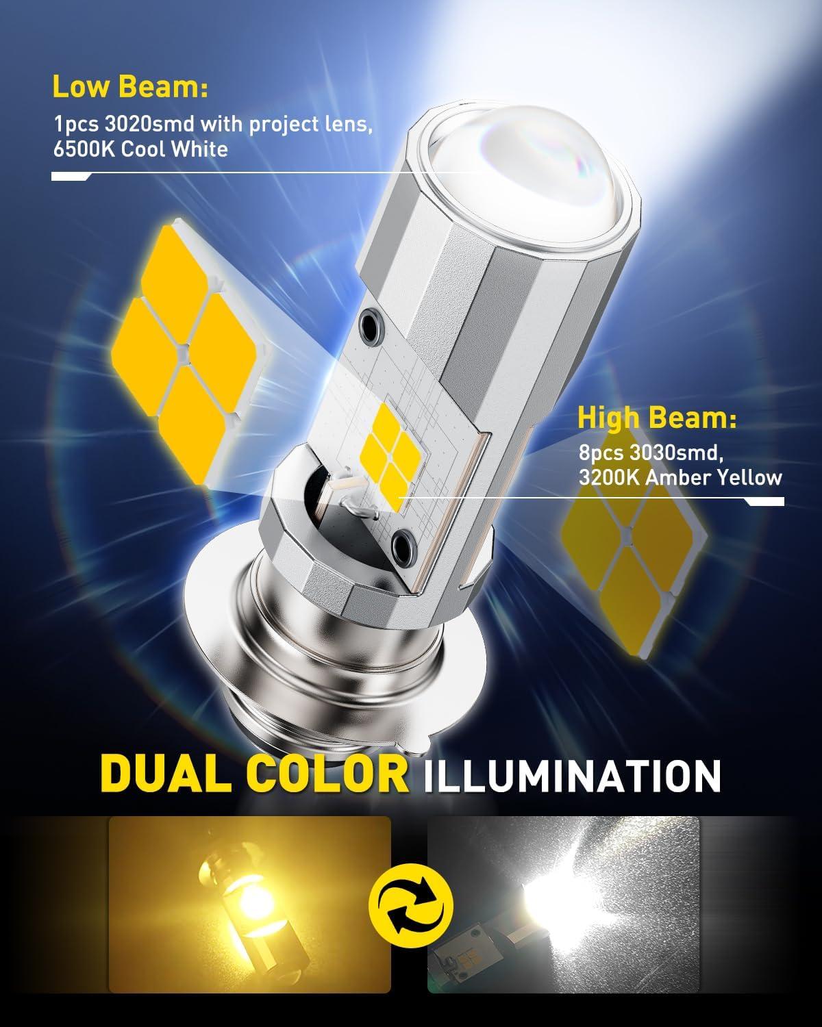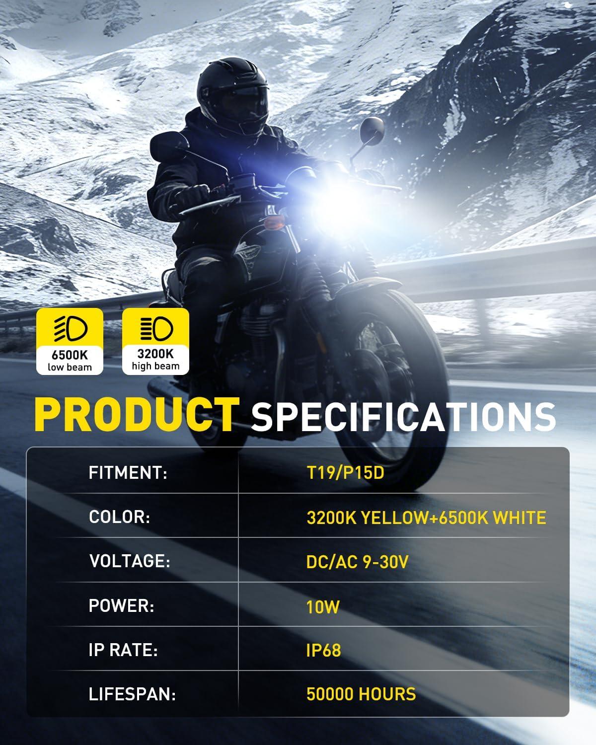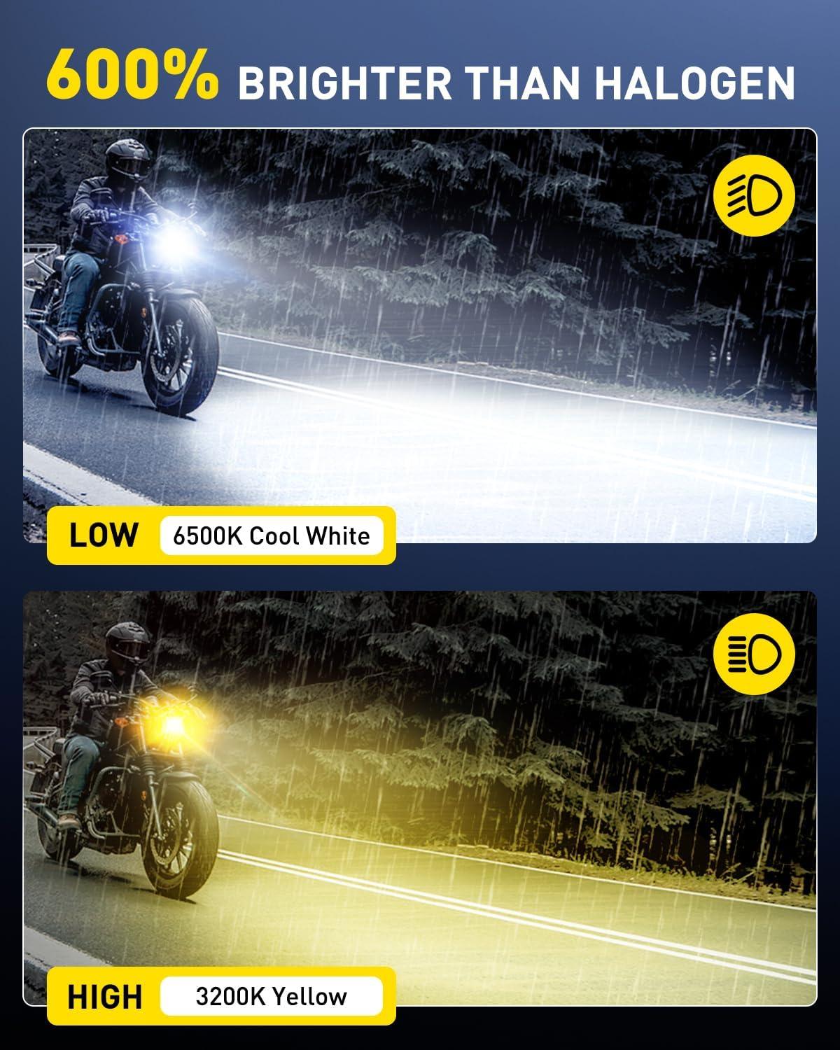 Dual Color & Dual Beam: The 6500K cool white low beam, enhanced with a projector lens, delivers a focused, brighter, and wider field of view for optimal road illumination. The 3200K warm yellow high beam offers superior penetration through rain, fog, and adverse weather conditions for enhanced safety.