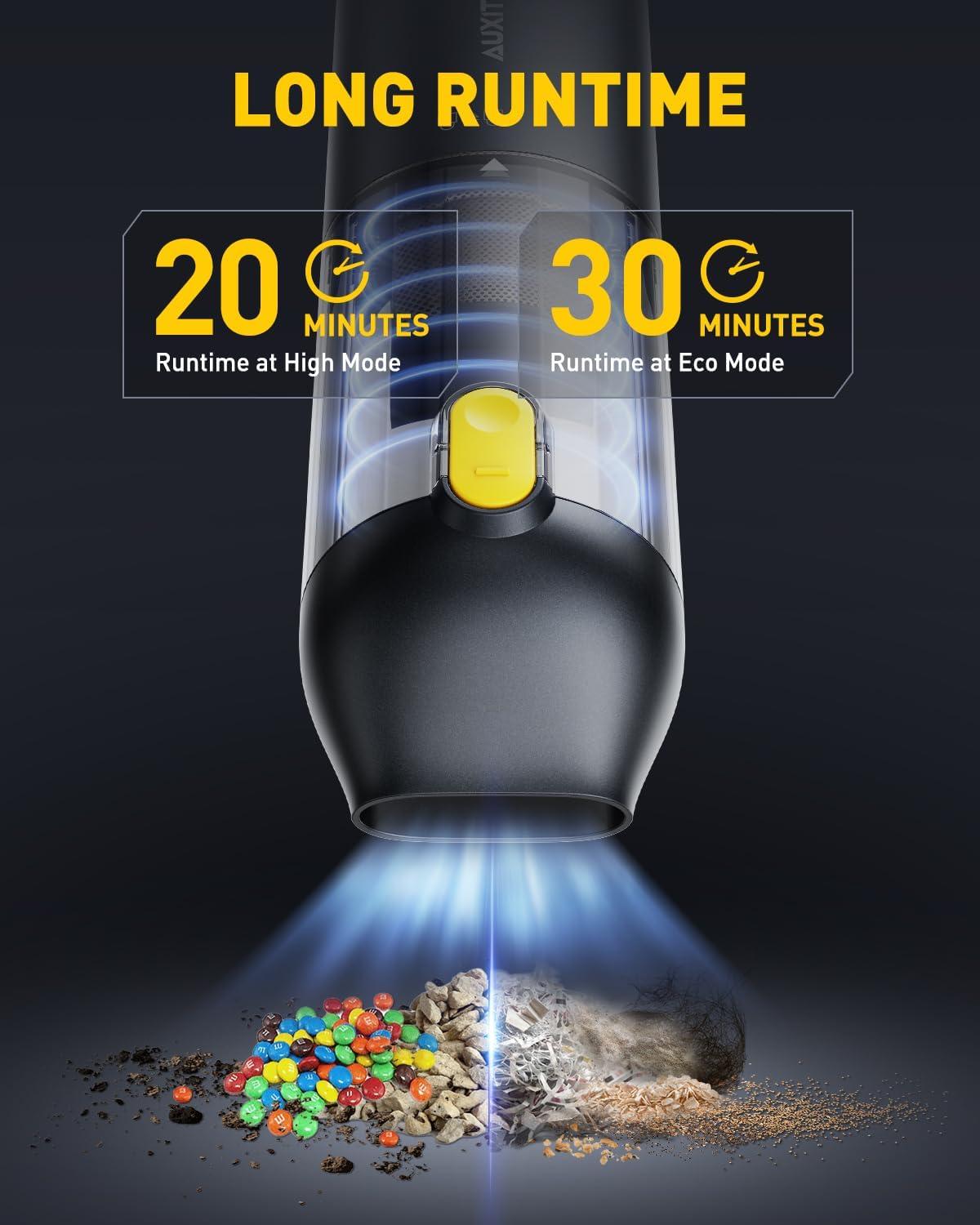 【14000PA HIGH POWER SUCTION HANDHELD VACUUM】The upgraded high-speed brushless motor delivers 14000Pa of powerful suction to quickly and easily pick up stubborn sand, dust, and debris. 2 suction modes of 8500PA and 14000PA are available to meet your different cleaning needs. Say goodbye to time-consuming and inefficient cleaning tasks!