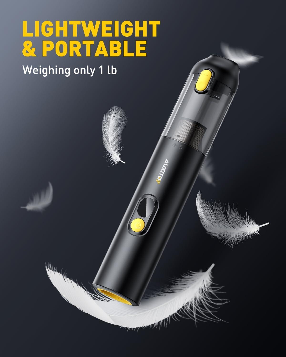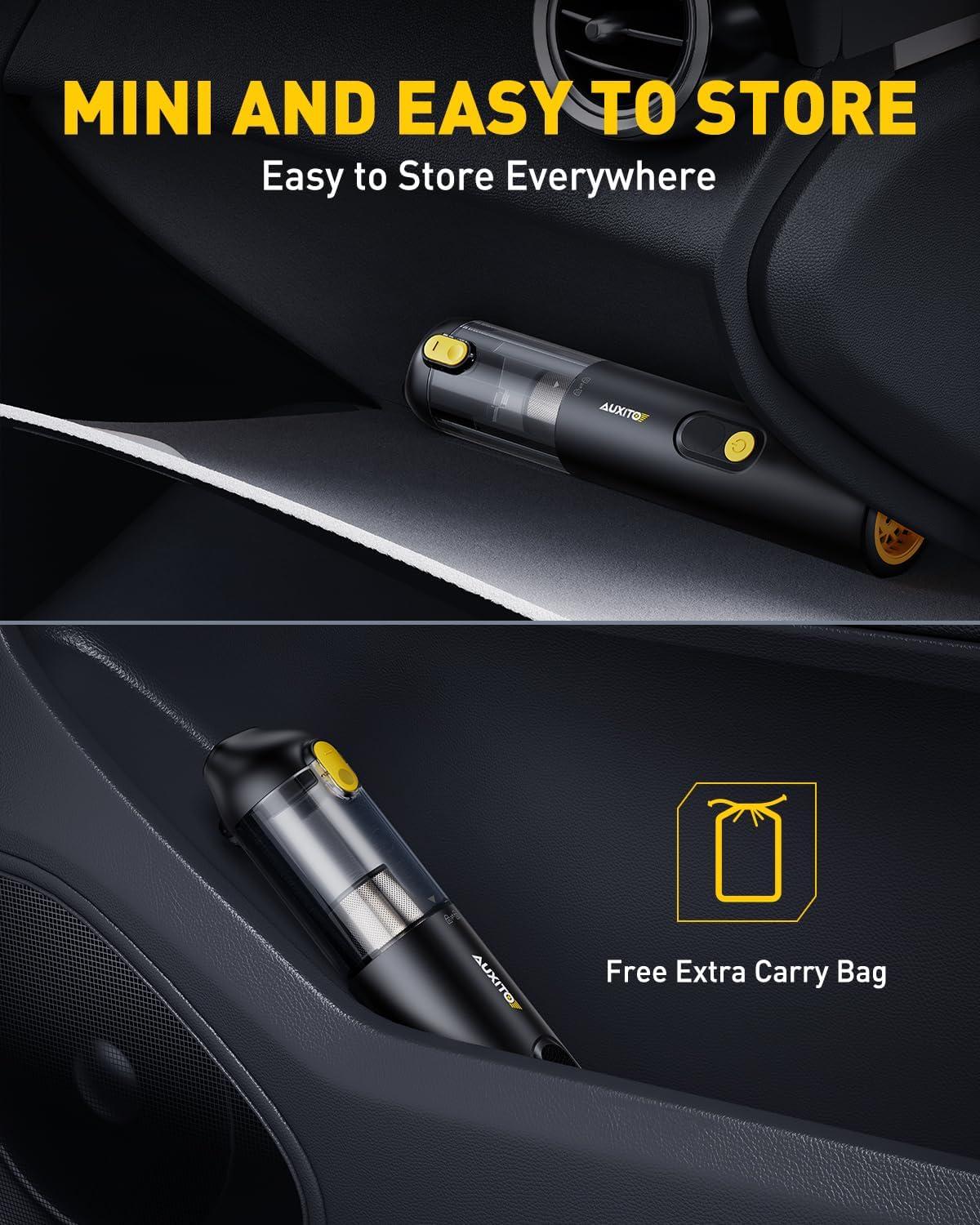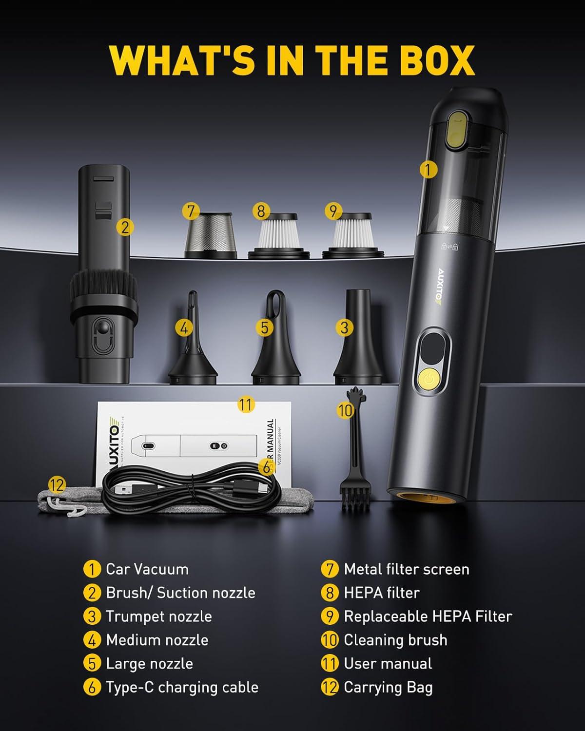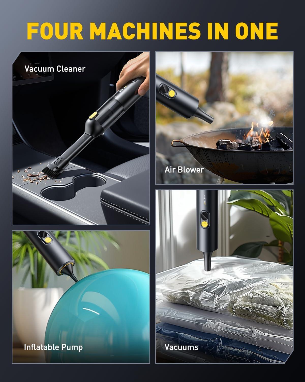 【4 IN 1 MULTI-FUNCTIONAL CORDLESS CAR VACUUM】AUXITO Mini Vacuum Car Cleaner is equipped with a variety of nozzles to perfectly meet the different needs of vacuuming, blowing, inflating and pumping. It not only quickly cleans car seats, trunks, floor mats, computer keyboards, sofas, carpets and any hard-to-reach places, but also helps to inflate yoga balls, swimming rings and all inflatable items, and vacuums air for all kinds of vacuum storage bags to save space.
