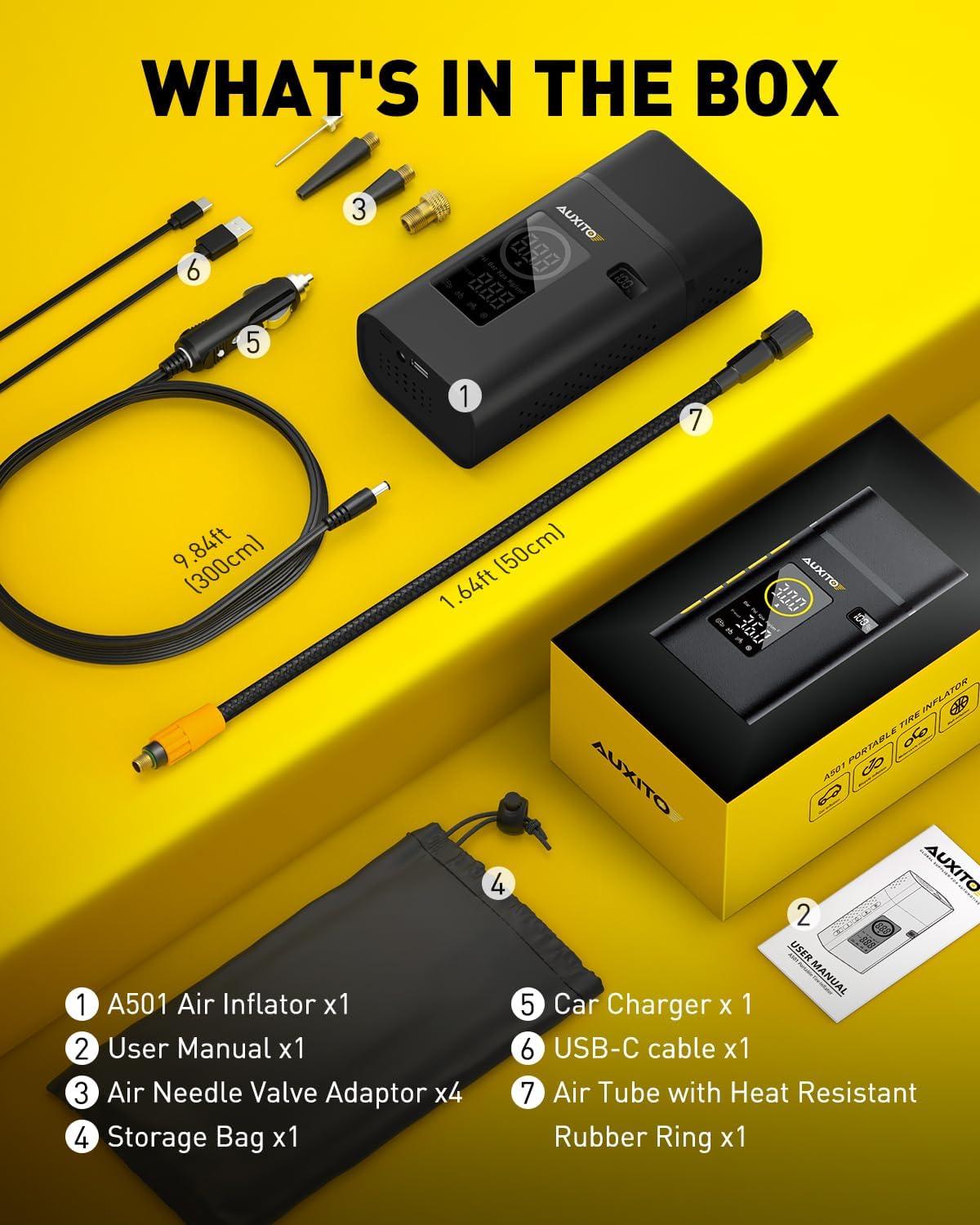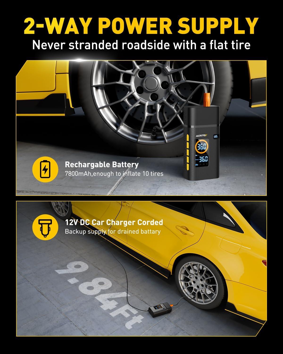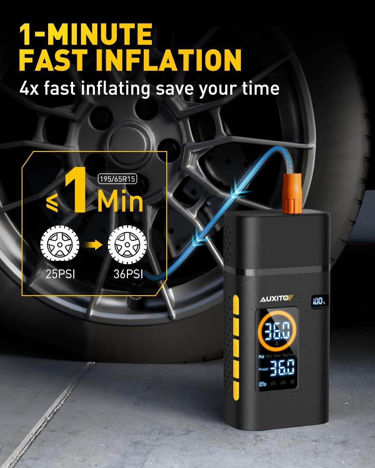 1 MIN Fast Inflation: AUXITO portable tire inflator equipped with upgraded air cylinder which can produce 36L/min airflow, pump up a standard car tire from 0psi to 36psi within 5 minutes, less than 1 minute to add 11psi (25-36), saving you valuable time when you're on the go, no more waiting around at gas stations.