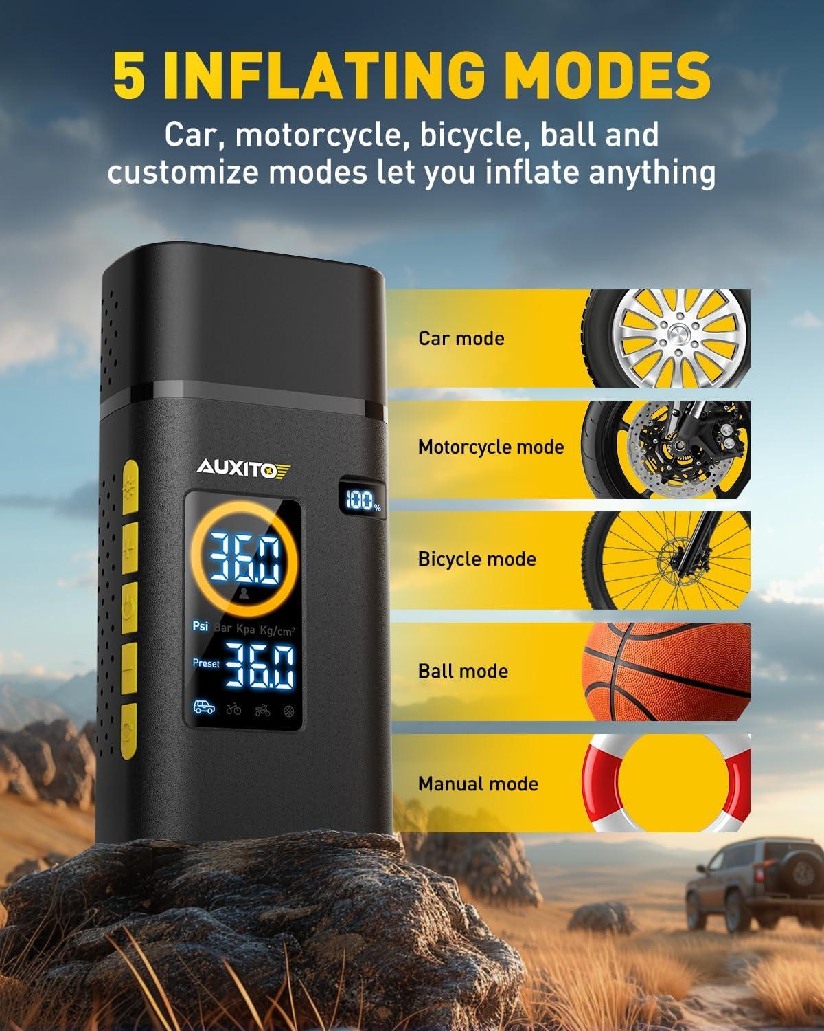 5 Inflating Modes: There are 4 preset inflation modes (cars, bicycles, motorcycles, and balls) and 1 manual mode ( 150psi max) to meet all needs of inflation. You can inflate tires, balls, toys, air bed and everything you want to pump. The digital inflator will remember the last set for convenient use, so you do not need to adjust each time.