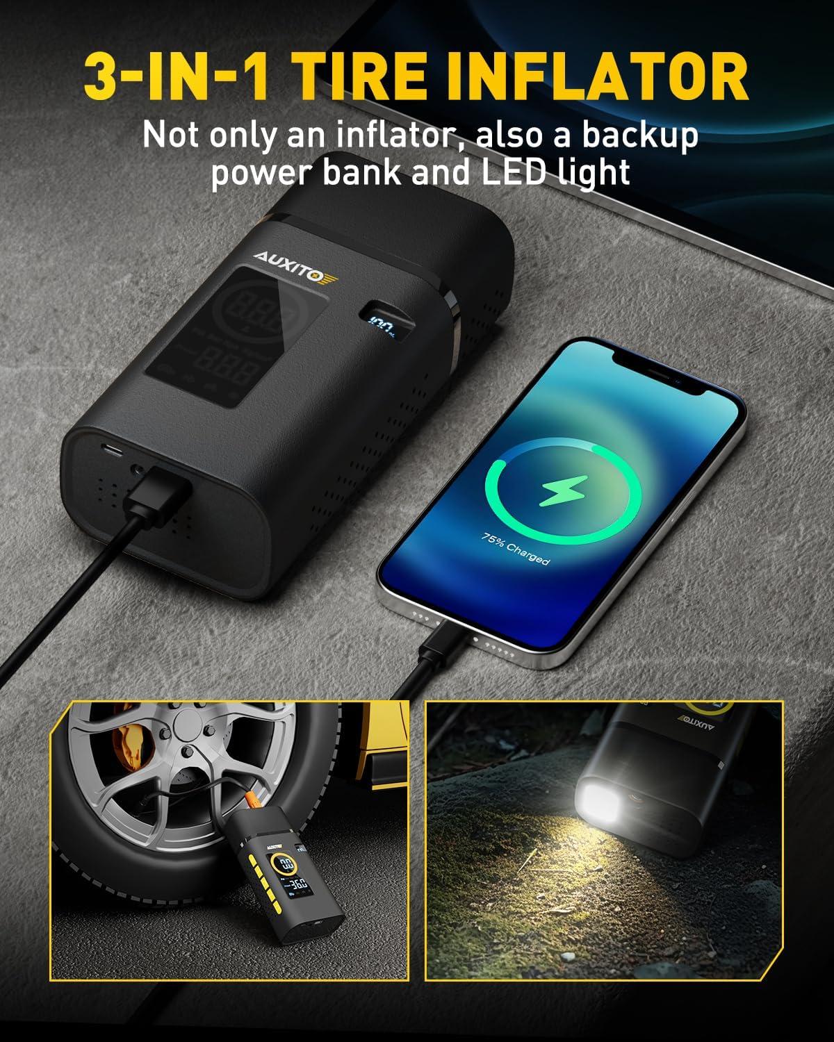 Not Only Tire Inflator: AUXITO compact air compressor not only efficiently inflates your tires in minutes, but also doubles as a power bank to charge your electronic devices and features a built-in LED light for emergency situations. You can use it to recharge your phone, pad and laptop with 5V/2A charging cable. At nights, you can use it as flashlight or emergency light. A must have on the road.