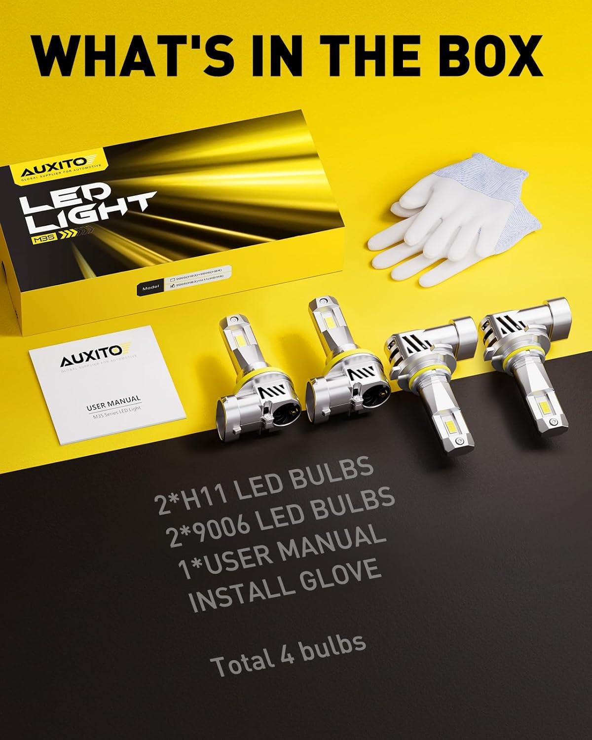 AUXITO Upgraded 9005/HB3 H11/H8/H9 Bulbs Combo, 1000% Highly Bright 6500K Cool White, Real 1:1 Mini Size, Canbus Direct Install Plug and Play, Pack of 4(9005/HB3)
