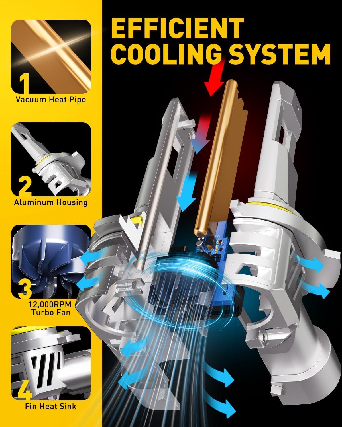 50,000 Hours Lifespan: With a Triple cooling system: Whole aviation aluminum body, built-in copper tube and 15,000RPM turbo cool fan that diverts heat away from the light's critical components, AUXITO 9005 h11 light bulbs offers 50000hr lifetime, reducing the need for frequent replacements. This can save you money in the long run and provide peace of mind knowing that your lights are less likely to burn out.